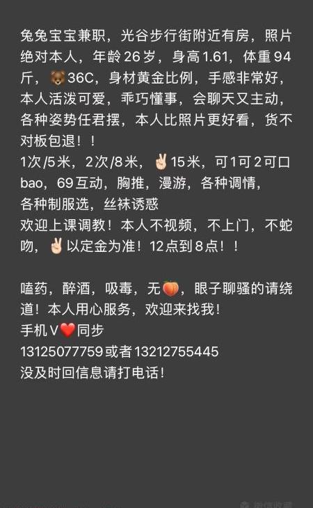 课本上写的基本服务都能满足,完事时间没到还会给你按摩一下,她说她在会所做过按摩手法还可以,对颜值没有要求,喜欢慢慢搞享受服务的可以找她,她包夜时间有点长11个小时不限次,这个在妹子中也是少有的,我没试过包夜,她课本上这样写了应该是真的,看来妹子为了挣钱留住客户也是拼了,没有颜值靠服务和时间留住我们,还好我就喜欢服务型的,对颜值没太高要求,只要不是那种年龄特别大下不了叉的就行,她照片是美颜过的,跟本人有7分像,纠结颜值的就不要去。个人体验,不喜勿喷。
