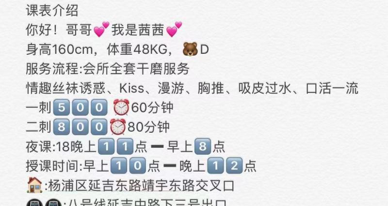 服务项目: 口活,漫游,胸推,吸皮过水,丝袜制服,爱爱